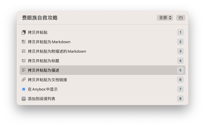 想要分享链接也很简单,直接在链接列表右键点击链接,即可在右键菜单中选择「拷贝为」或者「分享」两个动作。在「快速查找」窗口中,也可以通过右键点击或者按下键盘按键 Tab 来触发操作菜单,然后选择拷贝或者分享的操作。